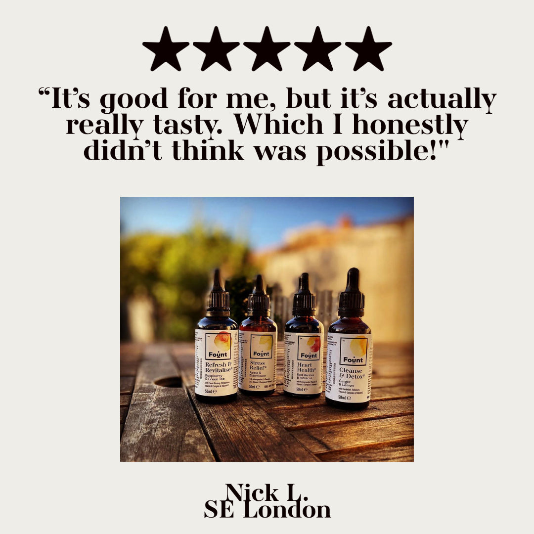 We are currently sold out of our 'Refresh & Revitalise: Raspberry & Green Tea'. This means we can't fulfil the Fount 4-Pack, but meanwhile we have created a 3-Pack at the same discount rate.